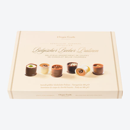 Hauchdünne, zartschmelzende kleine Becher Mit 5 köstlichen Füllungen Karamell, Kirsch, Marc de Champagne, Mokka, Praliné Aus exklusiven Zutaten Ein Genuss zum Kaffee oder als Dessertgarnitur Seit 1912 hat gefülltes belgisches Schokoladenkonfekt Weltgeltung. Hauchdünn und von zartem Schmelz sind die kleinen Becher aus Vollmilch-, weißer und dunkler Schokolade. So kommen die feinen Aromen der unterschiedlichen Füllungen perfekt zur Geltung. Genießen Sie fünf exquisite Kompositionen dieser erlesenen Pralinenspezialität. Karamell-, Kirsch-, Marc de Champagne-, Mokka- und Praliné-Füllungen zaubert der Maître Chocolatier aus exklusivsten Zutaten. Zum Nachmittagskaffee oder als Dessertgarnitur sind die edlen Pralinen eine köstliche Überraschung. 2 x 15 Pralinen, 400 g. Hagen Grote Exklusiv