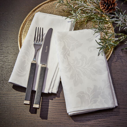 Exquisite Servietten für festliche Anlässe Mit dezentem, jacquardgewebtem Muster Aus 100 % veredelter Baumwolle Florales Ton-in-Ton-Dessin Passt sehr gut zu allen Geschirr-Dekoren und Dessins Gehört zu einer mehrteiligen Tischwäsche-Serie Mit dem edlen Ton-in-Ton Jacquard haben Sie immer die perfekte Tischwäsche für festliche Anlässe. Dezent ornamental gemustert passt sie ausgezeichnet zu allen Geschirr-Dekoren und individuellen Dekorationen, um Ihren Tisch persönlich und festlich zu gestalten. Der seidige Glanz der veredelten Baumwolle und die hochwertige Verarbeitung mit Gehrungssaum geben dem fein gedeckten Tisch seinen exquisiten Look. Die Servietten mit feiner Textur und festlichen Verzierungen harmonieren perfekt mit der Tischdecke (Nr. 113HZ24), den Sets (Nr. 113HZ22) oder dem Tischläufer (Nr. 113HZ23). Ob gefaltet in kunstvollen Formen oder einfach aufgelegt, verleihen Sie jedem Platz eine elegante Note. Aus 100 % feiner, merzerisierter Baumwolle. Feinwäsche 30 °C.