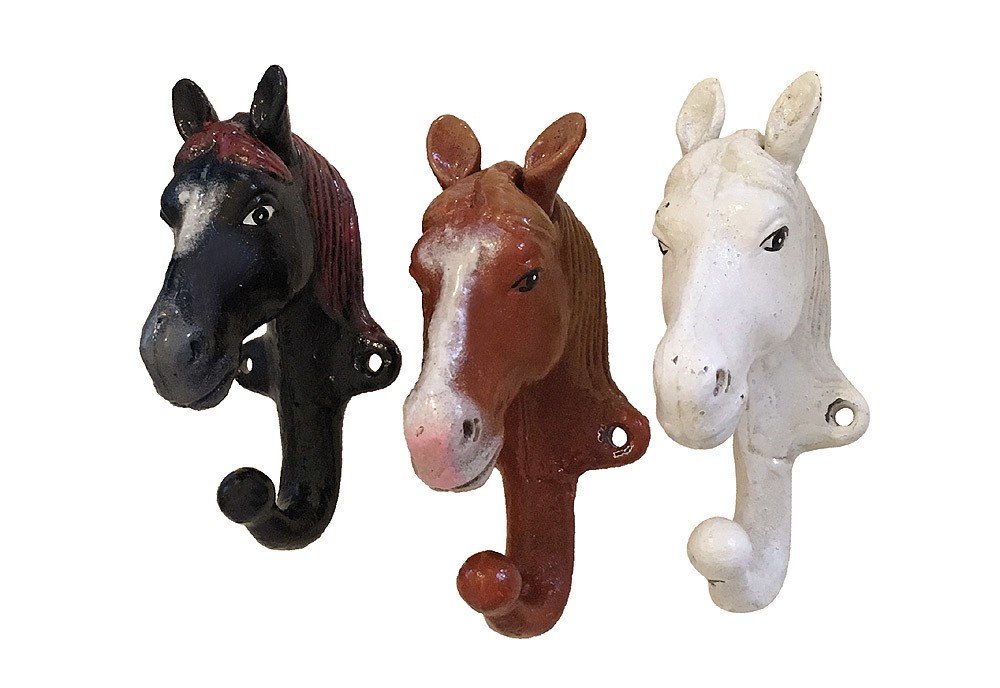 Garderobenhaken Pferde 3er Set – Ein tierischer Blickfang für Küche, Diele, Stall und Flur! 3er Wandgarderobe in origineller Pferde-Optik! Diese Garderobe fällt garantiert auf und überzeugt durch ihr originelles Design! Die 3 Pferde-Köpfe sind aus Gusseisen gefertigt und verschiedenfarbig lackiert. Ideal zum Verstauen von Jacken, Mänteln, Schlüsseln oder Handtüchern, uvm.! Farbe der Garderoben : 1 x schwarz, 1 x braun, 1 x weiß. Maße: (H/B/T) ca. 12,5 x 5,5 x 7,5 cm.