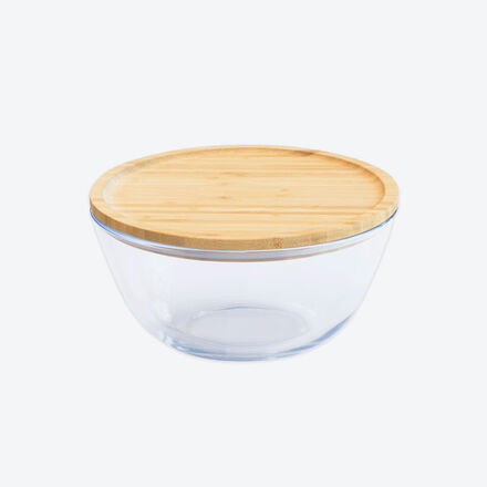 Halten Lebensmittel länger frisch Gesunde Alternative zu Kunststoff Aus hitzebeständigem Borosilikat Hartglas Absolut geschmacks- und geruchsneutral Edles Design Ihr getempertes Borosilikat Hartglas ist doppelt so stark wie Normalglas. Stöße oder extreme Temperaturschwankungen können ihm nichts anhaben. Mit drei unterschiedlichen Größen sind die Schüsseln zum Zubereiten, Anrichten und Servieren ebenso ideal wie zum Aufbewahren. Als Vorratsdose genutzt bleiben unter den luftdicht schließenden Bambusdeckeln mit Silikonring Lebensmittel länger frisch. Stapelbar, ohne Deckel spülmaschinenfest, mikrowellengeeignet, BPA frei. Klein, Ø 15 x 9 cm hoch, 770 ml. Mittel, Ø 19 x 11 cm hoch, 1,6 l. Groß, Ø 23 x 12 cm (T/H) 2,6 l.