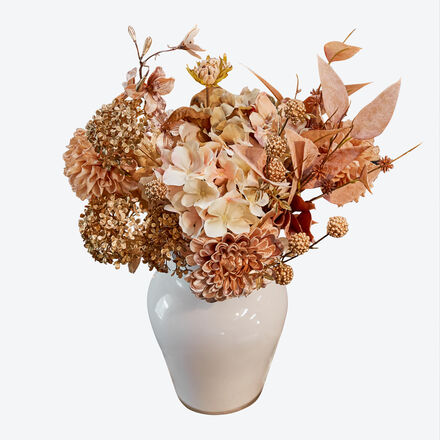 Prachtvoller Strauß in festlichem Gold und Creme Mit festlichem Schimmereffekt Extravagante Zusammenstellung Dauerhaft schöner Deko-Strauß Handgebunden Schon die Auswahl der Blüten ist außergewöhnlich – zarte Hortensien, cremefarbene Pfingstrosen, Rittersporn und beigen Dahlien wurden gekonnt mit goldfarbenen Maulbeeren, Schneeball und Eukalyptus zusammengestellt. Alle Blüten und Blätter wurden dafür en detail nachgearbeitet. In Gold- und Cremefarben mit Schimmereffekt veredelt haben unsere niederländischen Floristen daraus einen exklusiven Strauß geschaffen, mit dem Sie eine festliche Tafel oder Ihre Wohnräume zeitlos schick dauerhaft schmücken. Alle Komponenten des 50 cm hohen Straußes sind vom Original kaum zu unterscheiden und werden in den Niederlanden von Floristen handgebunden. Hochwertiges Textil- und Kunstmaterial mit Goldschimmer, ø 35 cm, 50 cm hoch. Julia Grote Exklusiv