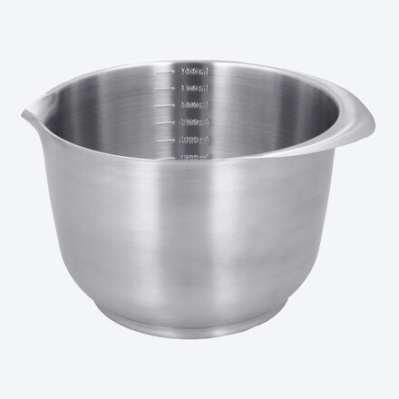 Auf dem gebürsteten Edelstahl bleiben Fingerspuren unsichtbar. Ein rutschfester (zum Reinigen abnehmbarer) Silikon-Bodenring sorgt für sicheren Stand. Griffe bieten festen Halt beim Aufschlagen. Innere Skalierungen erlauben sicheres Abmessen, tropffreier Ausgießer.