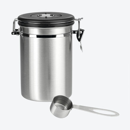 Aromaschonende Aufbewahrung Für Bohnen und gemahlenen Kaffee Luftdicht, hygienisch, frisch Mit Datumseinstellung für Einfülldatum Für 700 g Kaffee Das CO2-Frischeschutzventil unterbindet das Eindringen von aromaschädigendem Sauerstoff. Absolut luftdicht, hygienisch und frisch bewahren Sie darin ihren Kaffee auf (Bohnen, gemahlen). Mit Datumseinstellung für das Einfülldatum. Kaffeedose mit Bügelverschluss, Edelstahl/Polypropylen, 13 x 17 x 19 cm, 1,9 l Inhalt für ca. 700 g Kaffee, kommt mit Edelstahl-Messlöffel.