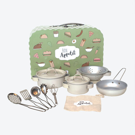 Kinderspielzeug Küchenutensilien Im handlichen Kinderkoffer Für stundenlangen Spielspaß und Rollenspiele Umfangreiches Set mit 13 Teilen Für Kinder ab 3 Jahren Mit eigenen Küchenutensilien im praktischen Koffer können die Kinder nach Herzenslust kochen Ob draußen im Sandkasten oder in einer Ecke in der großen Küche haben sie mit ihrer eigenen Spielküche viel Spaß Dabei ahmen sie die Eltern beim Kochen nach und lernen viel über Lebensmittel und deren Zubereitung Die Kinder Küchenutensilien sind für kleine Kinderhände konzipiert Der Umgang mit ihnen fördert die Feinmotorik und Geschicklichkeit Der handliche Kinderkoffer kann prima überall hin mitgenommen werden und enthält 13 Utensilien für kleine Köchinnen und Köche: Einen Topflappen, einen Spaghetti-Löffel, einen Schneebesen, einen Pfannenwender, eine Schaumkelle, eine Schöpfkelle, einen großen Topf mit Deckel, einen kleinen Topf mit Deckel, eine Pfanne und ein Sieb.