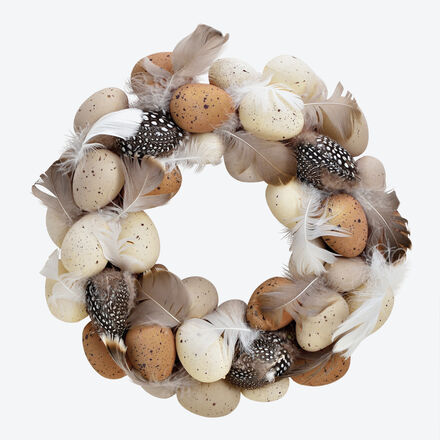 Schmückender Dekokranz für das Frühjahr Mit naturgetreu nachgebildeten Wachteleiern und Federn In hübschen Cremetönen Tisch- oder Türkranz Liebevoll und detailgetreu ist der naturfarbene Dekokranz mit Wachteleiern und Federn verarbeitet. Wie in der Natur ist jedes Ei in verschiedenen Cremetönen gefärbt und mit typischen Sprenkeln versehen. Die eingearbeiteten Federn geben dem hübschen Kranz seine verspielte Leichtigkeit. Als Tisch- oder Tüerkranz ein toller Hingucker im Frühjahr. Eier aus Kunststoff, Federn, Kranz aus Styropor, Ø 28 , 7 cm hoch.