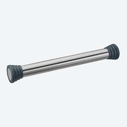 Ohne Kleben und Anhaften Auch für Kartoffelteig, Marzipan, Fondant Einstellbare Teigstärke Integrierte Messskala Zur Reinigung feucht abwischen Perfekt gleitet die hochwertige Teigrolle ohne zusätzliches Mehl über Ihren Teig. Alle gängigen Teige für Gebäck, auch Kartoffelteig, lassen sich mit dem praktischen Backutensil ohne Anhaften oder Kleben ausrollen. Auch geeignet für Marzipan oder Fondant. Für eine gleichmäßige Teigstärke von 2,5; 5, 7 oder 10 mm sorgen die aufsteckbaren Abstandhalter. Mit integrierter Messskala bis 38 cm zum Ablesen und Einstellen der Teigbreite. Edelstahl/Silikon, Ø 5,5 cm, 40 cm lang, zur Reinigung einfach feucht abwischen.