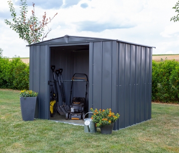 Auf einer Grundfläche von etwa 4,59 m² finden in dem geräumigen Gartenhaus die verschiedensten Gerätschaften und Accessoires ihren festen Platz – vom Rasenmäher bis zur Heckenschere. Und damit sie da auch bleiben, hat die doppelte, platzsparende Schiebetür eine Vorrichtung für ein Hängeschloss nach Wahl. Farbe: Schwarz, Material: 0,26-mm-Stahlblech, elektrolytisch verzinkt