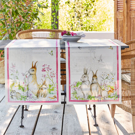 Festliches Motiv mit Hasen auf bunter Frühlingswiese Gefertigt in familiengeführter Textilmanufaktur in Florenz Langlebige und reißfeste Flachsfasern Maschinenwäsche 40 °C Erlesene Leinenqualität und sorgfältigste Verarbeitung machen die Tischwäsche aus reinem Leinen zu einem eleganten Tischschmuck. Auf dem Gewebe mit feinem Naturglanz setzt das Dekor mit verschiedenfarbigen Hasen auf einer bunten Frühlingswiese einen festlichen Akzent. Gefertigt in einer familiengeführten Textilmanufaktur in Florenz. Die verwendeten, reinen Flachsfasern machen die dekorative Tischwäsche extrem lange haltbar und reißfest. 100 % Leinen, Couvertecken, Maschinenwäsche 40 °C.