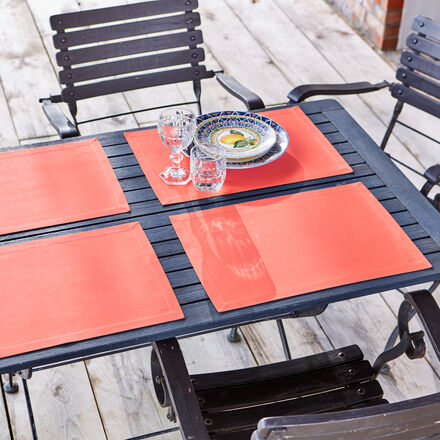 Outdoor-Tischsets in vielen Farben Wasch- und lichtecht Wetterfest und fleckabweisend Knitterarm und bügelleicht Äußerst strapazierfähig Die hochwertigen Heimtextilien werden für ihre besondere wasch- und lichtechte Brillanz aus fasergefärbtem Polyacryl gefertigt. Das angenehm weiche synthetische Material ist durch eine hochwertige Ausrüstung geschützt. Flüssigkeiten perlen einfach darauf ab. Schmutz dringt nicht in die Faser und lässt sich einfach feucht abwischen. Erstklassige Verarbeitung mit sauber vernähten Rändern in hochwertiger Couverttechnik garantiert außerordentliche Strapazierfähigkeit. 100 % Polyacryl, schwere Qualität (270 g/m²), waschbar bei 40 °C, knitterarm und bügelleicht. Wir empfehlen zum längeren Erhalt des Fleckenschutzes die Verwendung eines Wäschesacks.