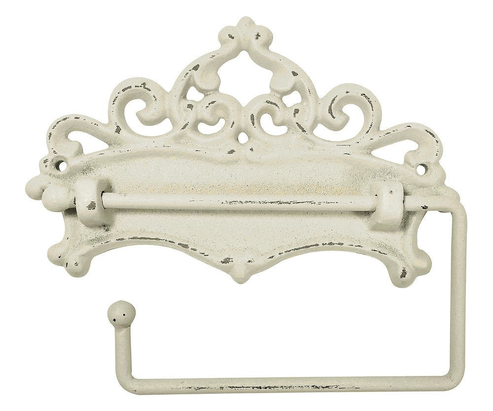 Antik-Weißer Toilettenpapierhalter in nostalgischem Stil – Ein besonderer Blickfang in jedem Bad und Gäste-WC! Dieser aussergewöhnliche Toilettenpapierhalter ist in rustikaler Handarbeit aus Gusseisen gefertigt und Antik-Weiß patiniert. Die geschwungenen Verzierungen verleihen dem schönen Halter eine besonders antike Ausstrahlung und machen ihn zu einem außergewöhnlichen Einrichtungs-Stück. Maße: (B/H) ca. 16,5 x 14 cm Abstand Bohrlöcher: ca. 13,5 cm