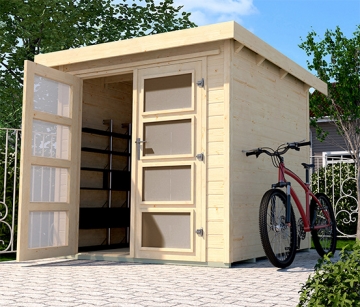 Was in dem Gartenhäuschen untergebracht wird, ist in mehrfacher Hinsicht sicher verstaut. Das Haus ist made in Germany und hat einen witterungsgeschützten Unterbau aus kesseldruckimprägnierten Bodenbalken. Die Wände sind aus Blockbohlen und das Dach ist wie der Fußboden aus gehobelten 16-mm-Brettern gefertigt – das sorgt für eine optimale Stabilität. Die massive Doppeltür mit Milchglaselementen und Sicherheitsüberwurf ist mit einem Zylinderschloss gesichert. Das Gartenhaus ist bei uns in drei Größen erhältlich und in der größten Ausführung hat es einen 230-cm-Anbau, den man zum Beispiel für das Lagern von Holz nutzen kann – oder man richtet sich darunter eine Gartenlounge zum Relaxen ein.